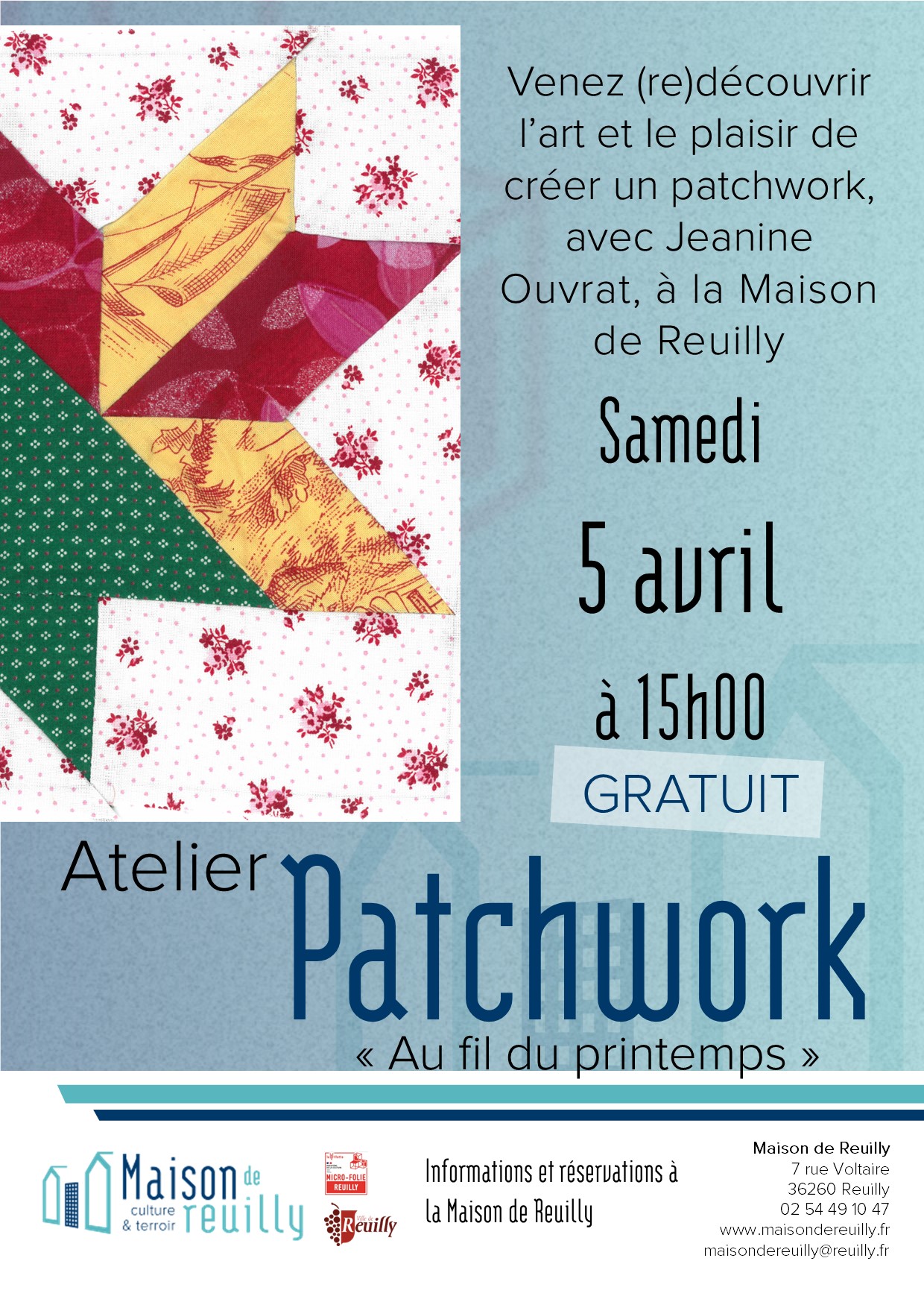 Atelier Patchwork « au fil du printemps » Posté 29 mars 2025 par Mairie Venez (re)découvrir l’art et le plaisir de créer une manique en patchwork, avec Jeanine Ouvrat, à la Maison de Reuilly. Partager sur les réseaux sociaux Facebook Twitter Google+